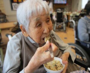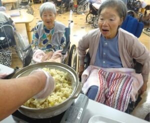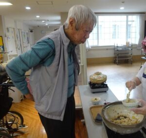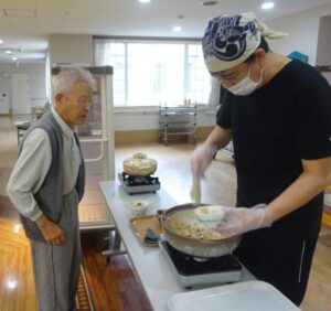 先日、昼食実演レクとして秋の炊き込み御飯を作りました。