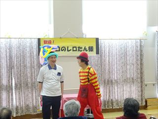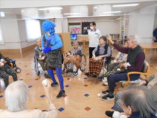 先日、2月の地域交流会を開催しました。今月は、ピエロのレロたんが来苑され、数々の大道芸を披露して下さいました。笑いと驚きにあふれる、あっという間の30分でした。