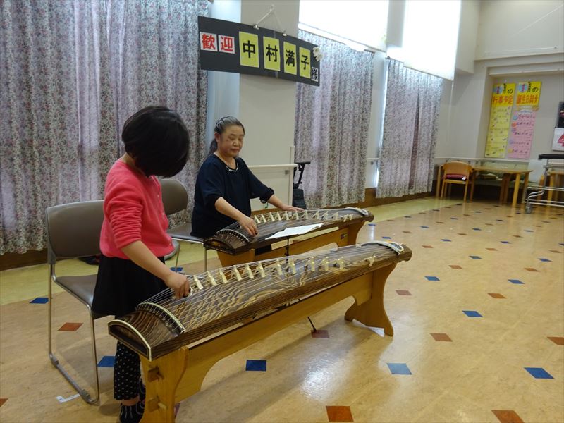 演奏に合わせて懐かしい歌や童謡を歌った後、琴に触れさせていただくことができ、その音色を楽ませていただきました。