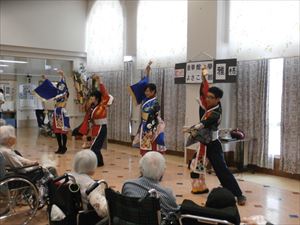 若い元気な掛け声と力強い踊りで、見ている利用者さんも