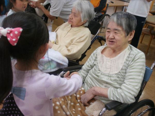 最後に子供たちが歌を歌いながら利用者さんに一人ずつ握手をして回って