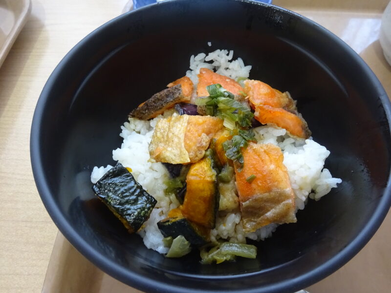 今回の選択昼食会はサーモンと夏野菜の南蛮丼VS味噌ロコモコ風丼でした。