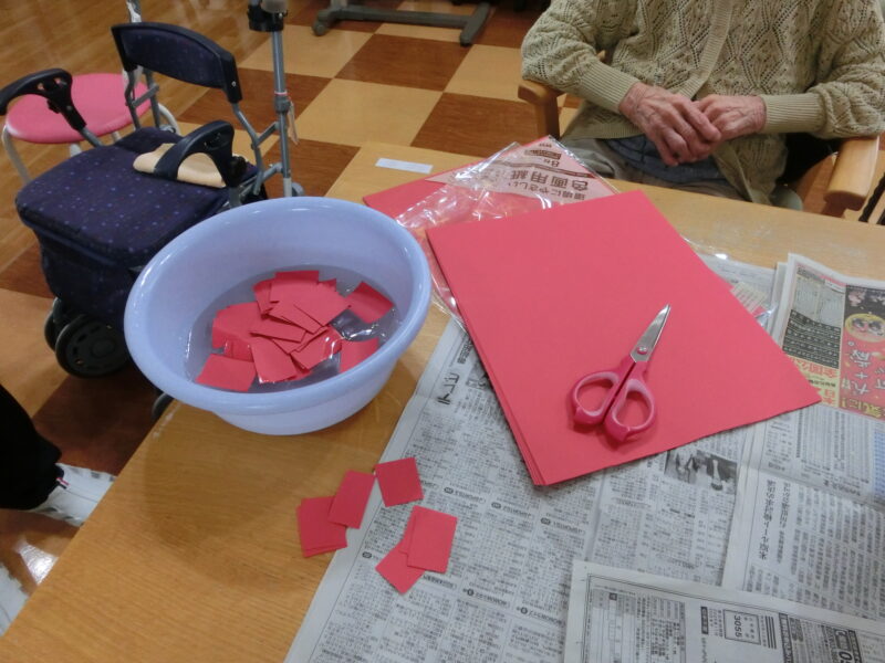 まずは色画用紙を小さく切り、水につけます。