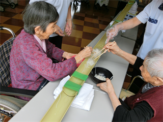 今年の七夕行事は流しそうめんを楽しみました。皆さん笑顔で食べられてました。